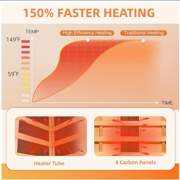 【Efektivní technologie vytápění】 Vybavená 4 uhlíkovými panely a 1 uhlíkovou trubicí, naše infračervená sauna s 1 osobou poskytuje 360 stupňové prostorové vytápění, což zajišťuje rovnoměrné rozdělení tepla. Obvykle se zahřívá za pouhých 10-15 minut, což vám umožní bez prodlení užívat si zážitek ze sauny.