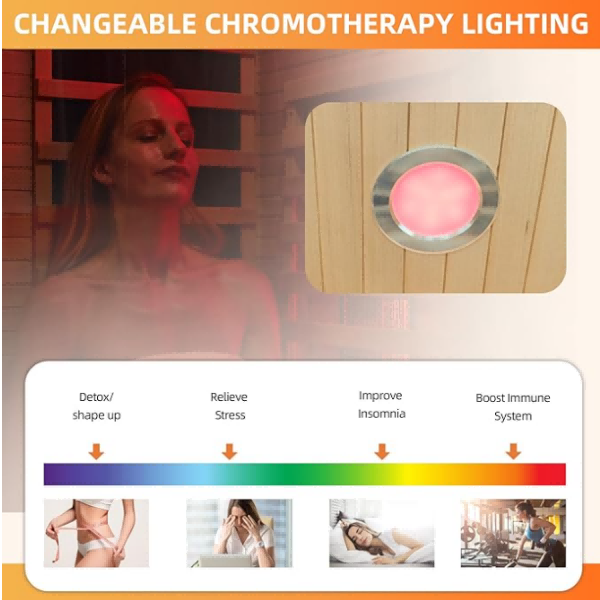 【Vylepšená relaxace】 Naše infračervené sauny pro domov mají střechu osvětlenou 7 barevnou světelnou terapií a vytváří pohlcující atmosféru, která posílí váš celkový zážitek. Je snadno instalovatelný ve vašem suterénu, koupelně nebo tělocvičně a s připojením Bluetooth a kyslíkovým barem si můžete užít relaxační saunu