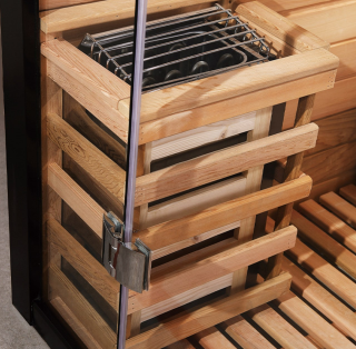 - Interiér přírodního cedrového dřeva: Interiér je obložen prémiovým cedrovým dřevem, které při zahřátí uvolňuje jemné uklidňující aroma. Cedr se také může pochlubit vynikajícím zadržováním tepla, účinně udržuje teplo v prostoru a odolává vlhkosti, aby se zabránilo deformaci.